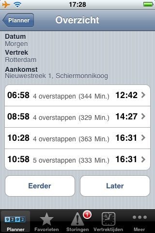 Overigens, over de snelheid: in volle 3G dekking, op een 3GS, duurt het opvragen van een reis (inclusief omzetten geocode) net zo lang als het versturen van een tweet in Twitterfon. Niets hinderlijks dus!