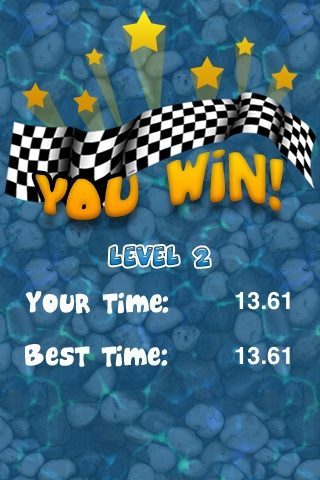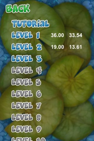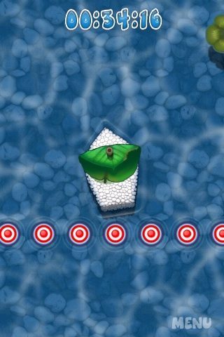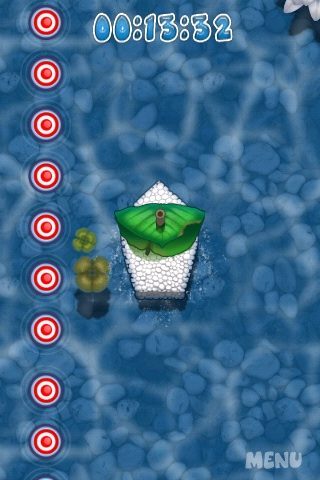 Op warme dagen kun je met deze game een behoorlijk paars hoofd krijgen van al dat geblaas. Vandaar dat Readdle ook nog een tweede bedieningsmogelijkheid aanbiedt: via het touchscreen en daardoor ook geschikt voor iPod touch-bezitters die geen microfoon hebben. Je sleept daarbij met je vinger het bootje over het scherm. Dat klinkt makkelijker dan het is, omdat er onderweg stroming staat en je de boot niet met je vinger kunt sturen: je kunt het alleen vaart geven. Tegelijk ‘duwen’ en de iPhone kantelen om de obstakels te vermijden vergt wat oog-handcoördinatie, maar het is te doen. De parcoursen zelf zijn niet echt moeilijk; wat het moeilijk maakt is dat je in de beperkte tijd moeilijk bij de finish kunt komen. Eén onverwachte botsing met een lelieblad en je bent de klos.