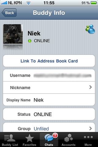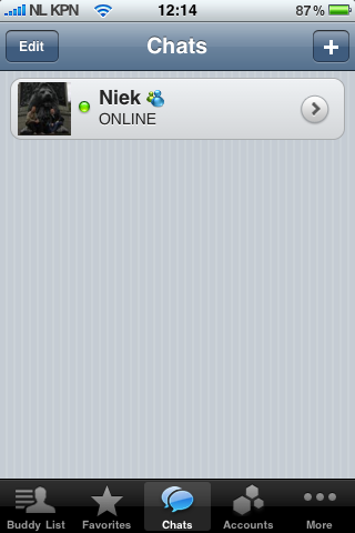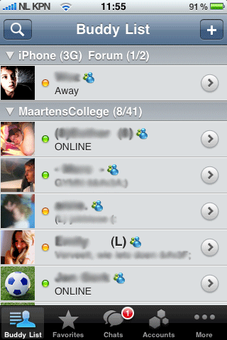 Ik mocht Niek gebruiken als testpersoon voor deze review. Beejive start ontzettend snel op, binnen 15 seconden ben je ingelogd (via Wi-Fi), bij 3G of EDGE zal het wat langer duren. Je belandt op je Buddy List, hier staan al je contactpersonen, verdeeld in de groepen die je hebt aangemaakt. Je kan makkelijk door je contactpersonen bladeren door met je vinger te flicken. Zelf druk ik eenmaal op Offline, want dan verdwijnen al je offline-contactpersonen. Hierdoor vind ik het nog overzichtelijker worden.