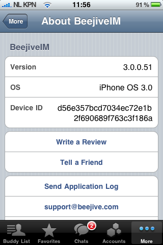 Na een aantal updates doorgevoerd te hebben is BeejiveIM aangekomen bij 2.2.0.24 (terwijl ze het zelf 3.0 noemen), de versie die compatibel is met iPhone OS 3.0. De mooiste verbetering is in 3.0 is de push notificatie in third-party apps. Ook Beejive, Inc. heeft hier kaas van gegeten. Je kan met MobileMe, MSN Live, Yahoo!, Google Talk, Facebook, MySpace, ICQ en Jabber inloggen. Dat is ontzettend veel in één applicatie.