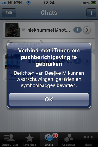 Ook is met BeejiveIM mogelijk push notifications te gebruiken, dit is een leuke feature. Bij het opstarten krijg je eerst een waarschuwing. Het idee is simpel: als je even wat anders wilt doen op de iPhone, bijvoorbeeld even wat opzoeken op het internet, moet je BeejiveIM afsluiten, met push notifications blijf je aangemeld bij BeejiveIM en kan je gewoon nog berichten ontvangen. Als iemand wat naar je stuurt, verschijnt er op je homescreen een badge met het aantal berichten dat is gezegd.