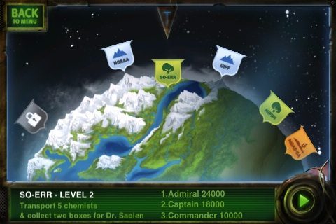 Na een korte tijd te hebben doorgebracht in het sfeervol vormgegeven menu, is het tijd voor mijn eerste vlucht. In een paar korte stukken tekst, voorzien van mooie illustraties, word ik ingeleid in het licht verteerbare verhaal. Mijn goede planeet is in strijd met boosaardige aliens, aan mij de opdracht om de slechterikken te grazen te nemen met mijn zeppelin!