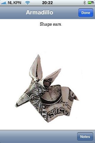 Met DollarOrigami kan je leuke figuurtjes vouwen van een biljet; zo kan je bijvoorbeeld een T-shirt, een ring of een vlinderstrik vouwen. Natuurlijk kan je uit veel meer dingen kiezen. Er is zelfs een apart hoofdstuk Animals! beschikbaar.