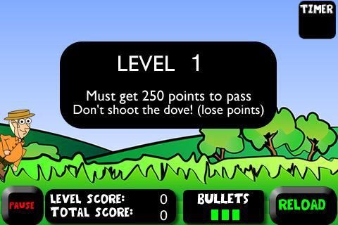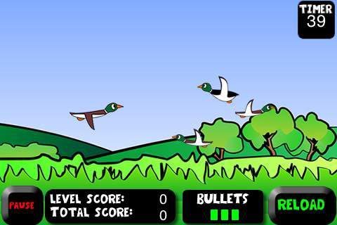 Duck Hunting is in feite erg simpel: er fladderen eenden door het beeld en die moet je met een vingertap neerschieten, terwijl je gelijktijdig probeert de witte duiven te ontwijken. Er passen maar drie kogels in je geweer, dus je zult steeds in de gaten moeten houden wanneer je moet bijladen. Elk level duurt 45 seconden, waarbij je zoveel mogelijk eenden moet zien te raken. Bij 250 punten of meer ga je door naar het volgende level. Bijzonder is dat er weliswaar vier omgevingen zijn, maar dat het aantal levels onbeperkt is. Toch is er een maximum, want de eenden vliegen in elk level steeds sneller, zodat er op een gegeven moment een level is waar de eenden te snel voorbij vliegen om ze überhaupt nog te raken.
