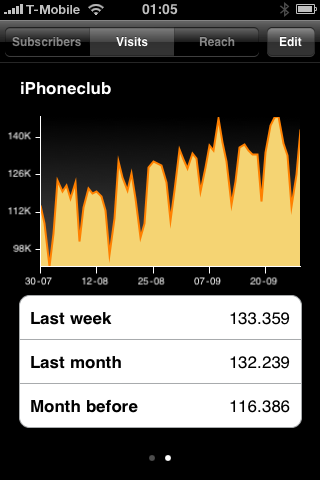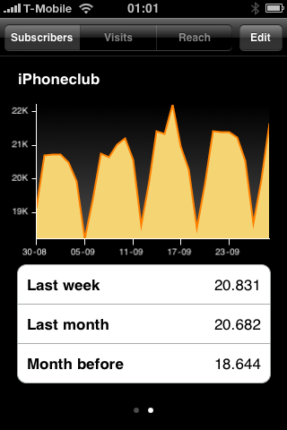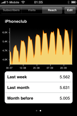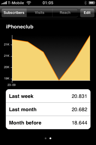 Per ingestelde RSS-feed kun je drie soorten grafieken bekijken: het aantal abonnees, het aantal views en het aantal bezoeken. Door op de opties ‘Last week’ (afgelopen week), ‘Last month’ (afgelopen maand) of ‘Month before’ (vorige maand en deze maand) te tikken kun je nauwkeuriger inzoomen op de gekozen periode. Zo kun je direct zien of er sprake is van een stijging of daling in de gekozen periode. Wanneer je meerdere RSS-feeds hebt aangemaakt kun je deze bereiken door met een swipe-beweging eenvoudig naar rechts te ‘bladeren’. De puntjes onderaan geven zoals gewoonlijk aan welke pagina (dus feed) je op dat moment aan het bekijken bent.