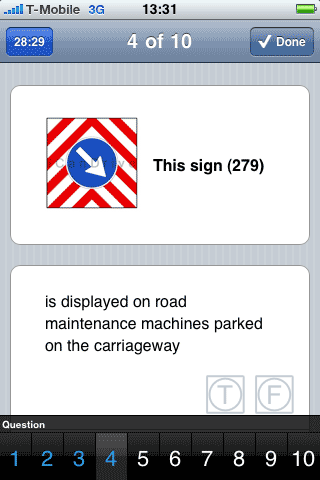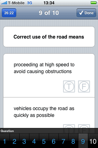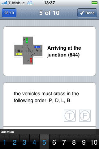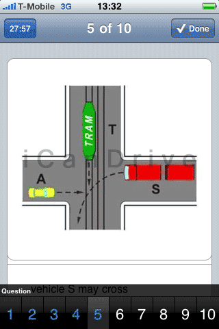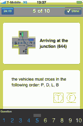 Grafisch gezien ziet de applicatie iCanDrive er niet eens zo mooi uit: de graphics zijn grof getekend en ook nog voorzien van een watermerk (waarom?). De schema’s van voorrangssituaties zijn bijna niet leesbaar, maar met een tik op de afbeelding krijg je het schermvullend te zien. Je kunt de test in meerdere talen uitvoeren, maar Nederlands zit daar helaas niet bij, waardoor je soms moeite hebt met specifieke termen en zoals gewoonlijk zitten er ook instinkers bij: betekent een bord met een opdruk van 6,5 ton dat de weg niet is toegestaan voor vrachtwagens van 10 ton? Correct zou je denken, maar het antwoord is toch incorrect. Een bord van 6,5 ton slaat op vrachtwagens 6,5 ton en meer en staat er niet specifiek voor vrachtwagens van 10 ton.