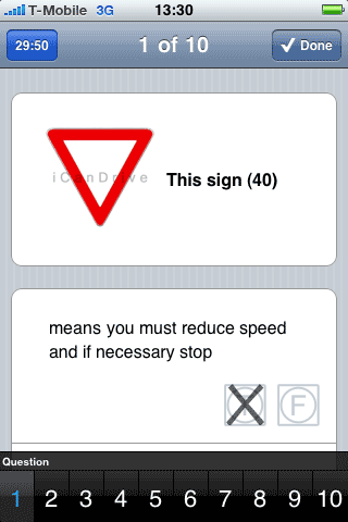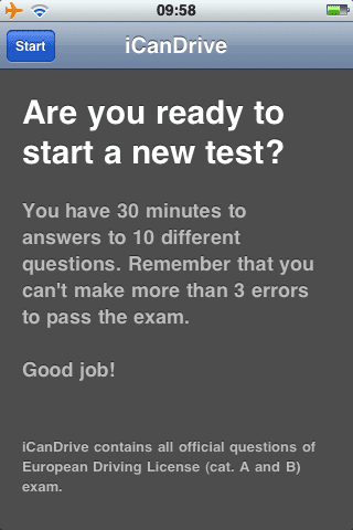 Ooit, ergens na 2011 komt er een Europees rijbewijs. Met de iPhone-applicatie iCanDrive kun je alvast oefenen of je door alle theorievragen komt voor het Europese rijbewijs A en B. Het is ook voor mensen die al langer hun rijbewijs hebben, een nuttige applicatie om eens te of je genoeg weet om probleemloos de Europese landen te doorkruisen. In iCanDrive heb je 30 minuten de tijd om 30 vragen te beantwoorden over voorrangssituaties, verkeersborden en veiligheid op de weg. De applicatie bevat 6.891 vragen en je bent geslaagd als je maximaal 3 vragen fout hebt. En dat valt nog niet mee…