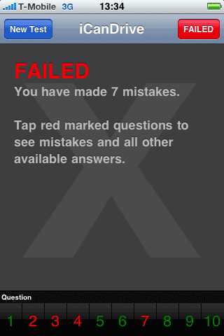 Europees rijbewijs? Voor mij voorlopig even niet: ik scoor niet verder dan 7 fouten. De applicatie is best leuk om voor €0,79 eens te kijken of je de Europese verkeersregels weet, om er vervolgens achter te komen dat de vragen nog steeds voor meerdere uitleg vatbaar zijn, net als toen je ooit zelf theorie-examen moest doen. De graphics in iCanDrive zijn lelijk, mede door de watermerken, je hebt geen mogelijkheid om eerdere resultaten terug te zien en er zit geen mogelijkheid in om vooraf de theorie te bestuderen. Voor een keertje leuk om te gebruiken, maar je raakt er vrij snel op uitgekeken.