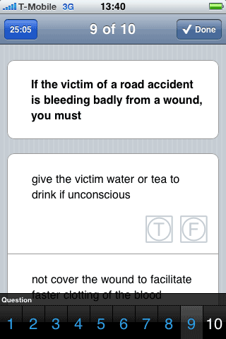 De 30 minuten zijn ruim voldoende om alle vragen te beantwoorden. Als je een beetje doorwerkt ben je in 5 minuten klaar. Bij elke mulitple choice-vraag vink je een T (True) of een F (False) aan. Je bent geslaagd als je niet meer dan 3 fout hebt. Dat blijkt nog een behoorlijke klus, want sommige vragen zijn voor meerdere uitleg vatbaar en er komen ook onderwerpen aan de orde waar je misschien nooit mee te maken hebt gehad, zoals ongevallen: moet je een bewusteloos slachtoffer water of thee laten drinken, mag je een bloedende wond afdekken en mag je ‘foreign objects’ uit een wond halen? Waar is bandenspanning zoal van afhankelijk (natuurlijk met de nodige strikvragen) en welke factoren bepalen je remweg? Die laatste twee vragen zijn onderwerpen die je met inzicht wel zou moeten kunnen beantwoorden.