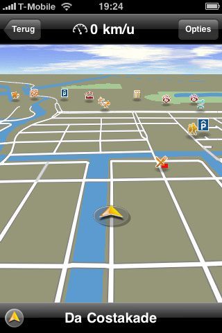 Om te beginnen de pluspunten van Navigon MobileNavigator. Als verstokt TomTom-gebruiker ben ik aangenaam verrast over de kwaliteit van de software en de overzichtelijkheid van de kaarten. De interface is mooi vormgegeven, de opties op het scherm zijn logisch gerangschikt en het invoeren van adressen kost weinig moeite. Alle denkbare methoden om de invoer te versnellen worden benut: postcode, favorieten, contactpersonen, thuisadres en laatste bestemmingen. Zelfs aan kleine details is gedacht, zoals de mogelijkheid om in het POI-menu snelkoppelingen naar favoriete categorieën aan te maken. Het berekenen van de route gaat na het invoeren van je bestemming zeer snel en ook bij het herberekenen van een route hoef je niet lang te wachten. Wel is er verschil merkbaar tussen de 3G en de 3GS: bij de 3GS gaat het allemaal wat vlotter en het leek ook alsof de GPS-ontvangst minder vaak wegviel.