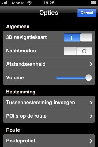 Tijdens het navigeren heb je toegang tot een menu, via de knop Opties. Deze lijst is nogal klein uitgevoerd: bij TomTom ben je gewend dat er steeds 6 grote knoppen in beeld ziet, die je makkelijk tijdens het rijden kunt aantikken. Bij Navigon zijn de instellingen best duidelijk en overzichtelijk, maar de letters zijn te klein om gelijktijdig te autorijden en de navigatiesoftware te bedienen. Voor het overschakelen naar de nachtstand zul je dus een passagier achter de hand moeten hebben of wachten tot je bij een stoplicht of op een parkeerplaats staat.