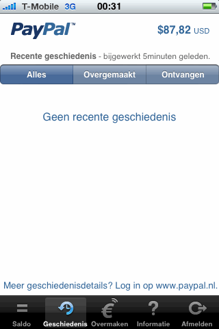 Na het installeren van de applicatie log je in met je PayPal-accountgegevens. Daarbij liep ik meteen tegen mijn grootste bezwaar tegen de applicatie aan: het inloggen lukte niet. Fout wachtwoord misschien? Nee, op de desktop lukte het inloggen wel. Het probleem bleek, dat de iPhone-applicatie geen sterke wachtwoorden ondersteunt. Nadat ik mijn wachtwoord had gewijzigd in een simpele combinatie van letters en cijfers (dus geen speciale karakters) lukte het inloggen in de iPhone-applicatie uiteindelijk wel. Juist bij zo’n financiële applicatie zou je toch verwachten dat sterke wachtwoorden worden toegejuicht.