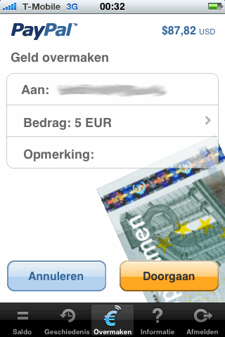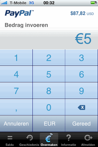 Na het inloggen komt je op het saldo-scherm, waar je je actuele saldo in dollars, euro’s en eventueel andere valuta te zien krijgt. Onderin het scherm zijn vijf knoppen zichtbaar: Saldo, Geschiedenis, Overmaken, Informatie en Meer. Het scherm Geschiedenis toont alleen je meest recente betalingen; zelfs de betalingen van gisteren zijn niet meer te zien. De knop Overmaken geeft je de mogelijkheid om geld over te maken naar een vriend. Je kiest een vriend uit je adresboek (of vult het e-mailadres in), kiest en bedrag en voegt eventueel een opmerking toe. Het gekozen bedrag ‘vliegt’ daarna met een geluidje en een animatie het scherm in. Bij het overmaken van 12 euro zie je dus een briefje van 10 euro en een munt van 2 euro (een beetje vergelijkbaar met SMS Betalen/CashMS).