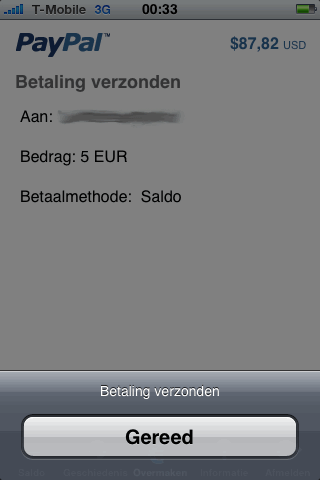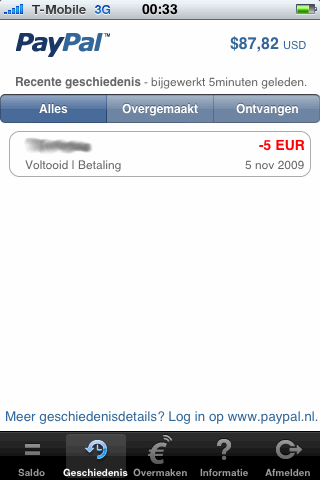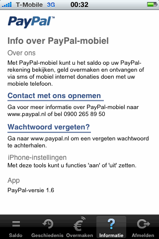 Eigenlijk heb ik maar één kritiekpunt op de PayPal-applicatie: mijn mooie, sterke wachtwoord wordt niet geaccepteerd. Ik weet niet of dat ligt aan hekjes, sterretjes of dollartekens, maar het is vervelend dat je eerst op de desktop je wachtwoord moet aanpassen om überhaupt bij de iPhone-applicatie te kunnen inloggen. Eigenlijk is dat vreemd, want de PayPal-applicatie is al een paar maanden in de Amerikaanse App Store verkrijgbaar en is inmiddels in versie 1.6 (dus reden genoeg om dit soort onhandigheden eruit te halen). De applicatie zelf doet wat het moet doen: vul een e-mailadres en een bedrag in en de betaling is binnen een minuutje geregeld, ook als het een buitenlandse vriend is waar je een betaling aan wilt overmaken. Wat dat betreft is PayPal erg goed, maar de iPhone-applicatie kan nog net iets beter.