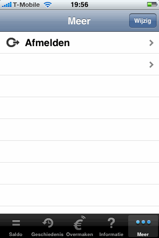 Toen we eerder schreven over PayPal dachten vrienden snel geld naar zichzelf konden overmaken wanneer je tijdens een feestje even naar de wc gaat (en daarbij de iPhone op tafel laat liggen). Ik heb dat geprobeerd, maar het lukt niet. Zodra je de applicatie verlaat ben je namelijk uitgelogd en als je de applicatie open laat staan op de iPhone ben je ook binnen een minuut of drie uitgelogd (de exacte tijd wordt niet in de applicatie genoemd). Je loopt dus alleen risico als je geld naar iemand overmaakt en de iPhone met geopende PayPal-applicatie meteen uit je handen wordt gegrist. Iemand moet dan binnen twee, drie minuten geld naar zichzelf overmaken. Om dat te voorkomen kun je na het uitvoeren van de betaling beter even op de homeknop drukken, zodat je zeker weet dat je bent uitgelogd. In de applicatie zelf is ook een afmeldknop aanwezig, te bereiken via de More-knop. In dat More-menu staan twee opties, die allebei ervoor zorgen dat je uitlogt. Dit ziet er wat slordig uit (zie screenshots).