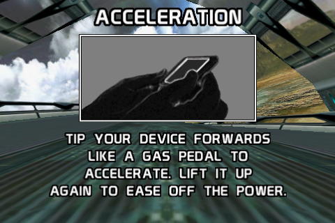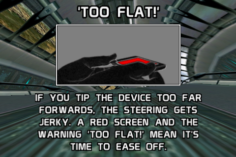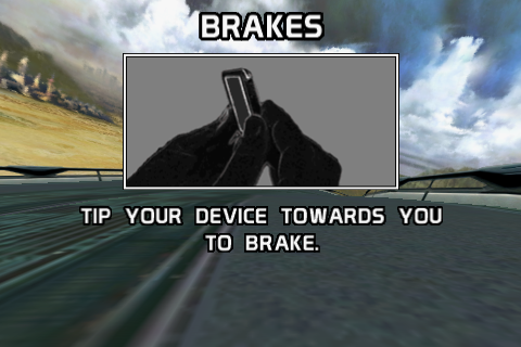 Remmen doe je door het scherm naar achter te kantelen. In de praktijk heb je die laatste het minst nodig, alhoewel het bij latere circuits toch handig is dat je een instant brake kunt uitvoeren, vlak voor een scherpe bocht. Met deze manier van besturen blijft het hele scherm vrij om om je heen te kijken, wel zo handig gezien de hoge snelheden waarmee je racet. Klein nadeel is dat er geen map view aanwezig is op het scherm. Je kunt dus niet zien welke bochten eraan komen of waar je tegenstanders zich bevinden op de baan.