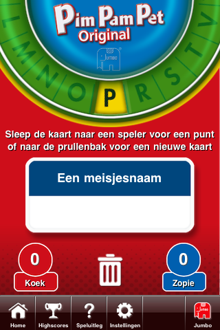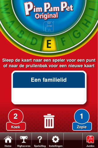 De iPhone-applicatie van PimPamPet is erg simpel gehouden. Het is niet echt een spel voor de iPhone, het is meer de faciliteit voor het spel. Je hoeft de antwoorden bijvoorbeeld niet in de microfoon van de telefoon te roepen waarna het apparaat bepaalt of je het goed hebt. Nee, het combineert de kaarten, de draaischijf en de puntenteller maar laat de bediening aan de speler. Als team (of speler) Rood een punt goed heeft, sleep je een kaartje naar links, als team Blauw een punt heeft, gaat ‘ie naar rechts. Bij geen goed antwoord mag het kaartje in de prullenbak in het midden gekieperd worden. Of draai je stiekem nog een keer aan de letter-schijf. De app legt je geen strobreed in de weg. Wel moet je even goed mikken met het kaartje. Het wil wel eens voorkomen dat een punt pardoes in de prullenbak belandt.