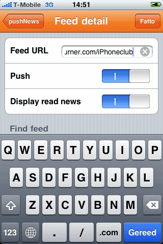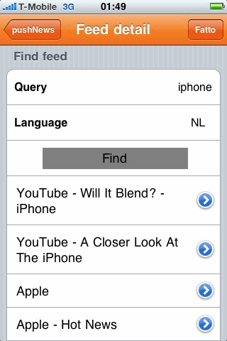 Bij het opstarten van Push News is de eerste indruk niet al te best: het splashscreen ziet er nogal amateuristisch uit (Comic Sans-alert!). Er zijn twee manieren om nieuwe feeds toe te voegen: handmatig door het intikken van de URL of door het zoeken op trefwoord. Dat laatste is nogal zinloos: vul je de zoekterm ‘iPhone’ in, dan krijg je wat suggesties voor YouTube-filmpjes en de Apple-website, ongeacht welke taal je invult.