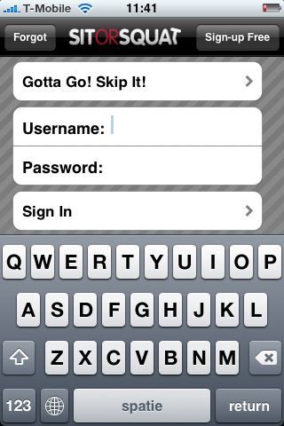 Wanneer je SitOrSquat opent dan wordt er gevraagd om je te registreren. Hiermee proberen ze misbruik te voorkomen in het wiki-gedeelte van de applicatie. Voor degenen die zich niet willen registreren is er alleen de mogelijkheid om toiletten op te zoeken. Gelukkig is het registreren erg eenvoudig en kun je snel gebruik maken van de applicatie.