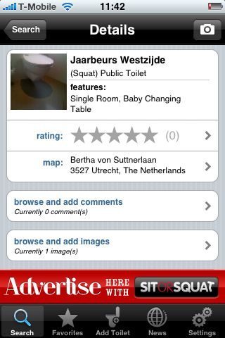 Na het zoeken kies je een wc uit en kom je op de detailpagina van de gekozen wc. Van daaruit kun je met Google Maps de route plannen, reacties lezen en eventuele foto’s bekijken. De kracht van deze applicatie komt hier naar voren vanwege de mogelijkheid om informatie aan het toilet toe te voegen. Je kunt de toilet een cijfer geven, van een beschrijving voorzien en een foto toevoegen van het toilet. De keren dat ik de applicatie gebruikt heb vond ik opvallend veel foto’s van toiletten. Blijkbaar zijn er echt mensen die foto’s maken van wc’s en deze op SitOrSquat.com zetten.
