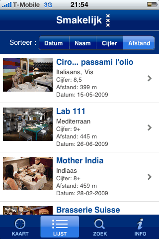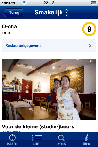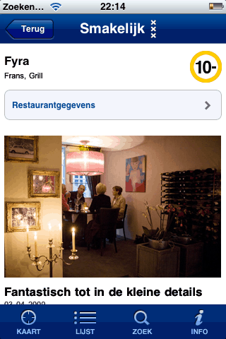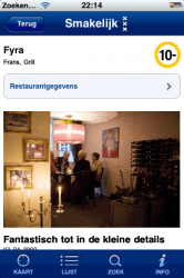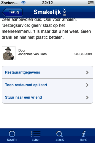 In Amsterdam heb je het ‘Van Dam-effect’, als Johannes een zaak de grond in boort, is hij meestal twee maanden later failliet. Omgekeerd, als hij een 9 of 10 uitdeelt, kun je de eerste maanden niet reserveren omdat ze vol zitten. Daarom is deze app (ondanks de slome navigatie) zo fantastisch: op vrijdag kun je al de recensie lezen en meteen bellen voor een tafel. Dus nu maar hopen dat niet teveel iPhone bezitters dat ontdekken, anders heb je weer een wachtlijst.