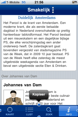 Bij het maken van de applicatie is gedacht aan handige extra’s, zoals het rechtstreeks bellen van een restaurant door het aantikken van een linkje in de applicatie of het plannen van een route met Google Maps vanaf je huidige locatie. Toch is de applicatie me een beetje tegengevallen: het opstarten van de applicatie duurt te lang, het inzoomen op de kaart werkt niet soepel en bij het bladeren door de restaurantrecensies treedt er ook een rare vertraging op. Terwijl je bij het bladeren door een webpagina gewend bent om realtime reactie te krijgen op je vingerbewegingen, gaat het bij Smakelijk Amsterdam iets schokkeriger en trager. Blader je in een applicatie zoals NU (of een willekeurige andere nieuwsapp) door een lijst, dan reageert de app meteen op een swipe-beweging, maar bij Smakelijk Amsterdam schiet de lijst soms een stuk verder, terwijl je al niet meer aan het bladeren was. De applicatie is ook wat slordig geprogrammeerd: als je iets te lang op één van de tabknoppen onderin het scherm tikt, wordt er een kopieeractie gestart (zie screenshot).