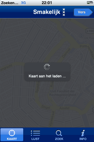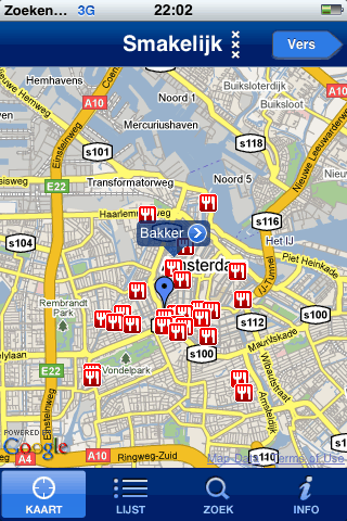 De iPhone-applicatie start met de vraag of je huidige locatie gebruikt mag worden. Smakelijk Amsterdam laat daarna een kaart van Amsterdam zien met icoontjes bij de restaurants die al getest zijn. Je eigen locatie is ook te zien met een blauwe Google Maps-pin. Het bekijken van restaurants op de kaart is wat lastig, want de kaart reageert erg traag als je inzoomt en bij het aantikken van een restaurant-icoontje krijg je niet meteen een informatielabel te zien. Zoom je in op een bepaald gedeelte van de kaart, dan kan het een behoorlijke tijd duren voordat de icoontjes weer in beeld verschijnen. Het aantikken van icoontjes vergt ook een gebruiksaanwijzing: het is niet de bedoeling dat je op een icoontje gaat drukken, maar je moet het even kort aantikken. Het labeltje verschijnt daarna meteen elders op de kaart (“huh, daar zat ik toch helemaal niet te tappen?”), maar als je de applicatie even de tijd geeft om de locatie aan te passen zal de kaart centreren rondom het aangetikte restaurant.