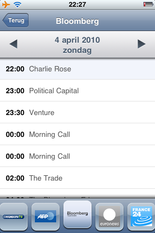 Minder leuk is de banner die bij het opstarten van elke zender in beeld verschijnt. Je zit soms 15 seconden naar een schermvullende reclame-afbeelding van één van de SPB-producten te kijken, maar dat zal de prijs zijn die je betaalt voor een gratis app. Een ander minpunt is dat het alle zenders een geïntegreerde tv-gids hebben. Bij de Nederlandse zenders is dat maar zelden het geval. Ik vermoed echter dat dat aan de zenders zelf ligt (die de informatie niet aanleveren) en niet aan SPB.