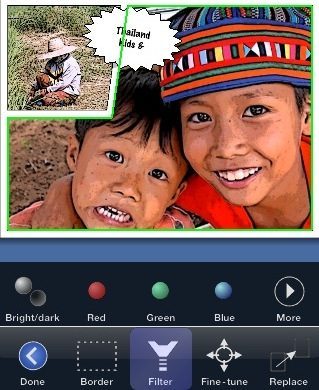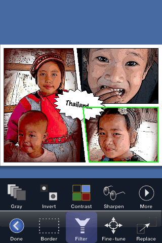 Er zijn diverse filters die je kunt gebruiken om jouw foto’s aan te passen: een grayscale-filter, invert-filter, contrastfilter, verscherpen en een sepiafilter. Tevens zijn er nog een Sketch-filter, een Halftone-filter en mijn favoriet: een Comic-filter. Per foto kun je de kleuren aanpassen (rood, groen en blauw) en de kleuren lichter en donkerder maken.
