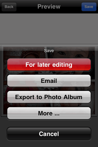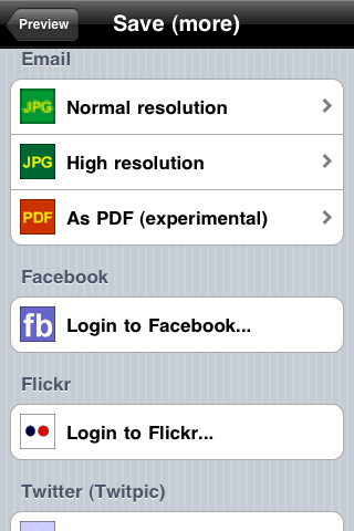 Er zijn diverse manieren om de strips op te slaan en uit te wisselen. Je kunt de strip opslaan voor als je later verder eraan wilt werken. Versturen per e-mail kan je op verschillende manieren doen: direct of via More… eerst een resolutie kiezen, waarmee je de strip wilt versturen (er is keuze uit twee opties: hoge of hogere resolutie). Je kunt de strip direct op jouw iPhone opslaan en zelfs als PDF versturen. Tevens kun je direct vanuit Strip Designer de strip versturen naar Facebook en Flickr, of direct naar Twitter versturen via Twitpic.