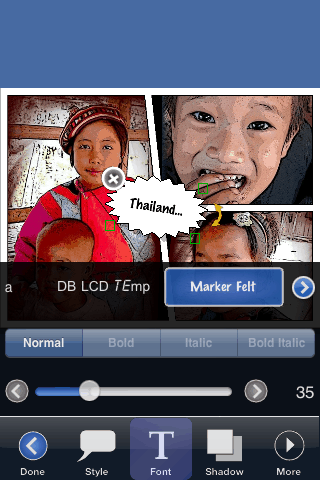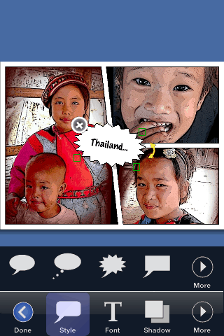 Als de foto’s gereed zijn kun je ze nog opleuken door er tekstballonnen bij te plaatsen. Dit doe je door simpelweg ‘Add’ te selecteren en de ballonnen komen tevoorschijn. Als je jouw selectie gemaakt hebt kun je ze groter of kleiner maken, de kleur van het kader kiezen en natuurlijk jouw eigen tekst erin zetten. Je kunt kiezen uit diverse lettertypes. Onder de tekstballonnen kan je ook nog een schaduwrand zetten. Het is mogelijk om de tekstkleur, de outline en de achtergrondkleur te veranderen. Omdat de iPhone een relatief klein scherm heeft kun je in Strip Designer in- en uitzoomen. Ook is het mogelijk in landscape te werken.