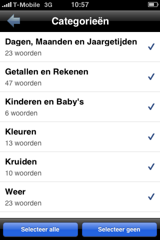 Het hoofdscherm van de applicatie bestaat uit een aantal onderdelen: bovenin Plan, voor het samenstellen van je studieplannen. Je kunt hier aangeven welke categorieën je wilt bestuderen. Omdat Accelastudy Essentials maar een beperkte woordenschat bevat zijn de categorieën ook beperkt: Dagen/maanden/jaargetijden, getallen en rekenen, kinderen en baby’s, kleuren, kruiden, weer en winkelen. Moeilijke woorden kun je met een mapicoontje rechtsonder in het scherm naar één van je zelfaangemaakte Studiepakketten kopiëren, zodat je ze later nog eens goed kunt bestuderen (het is wat slordig van een taalapplicatie dat ze hierbij de foute schrijfwijze ‘copiëren’ gebruiken).