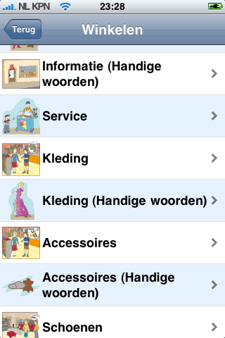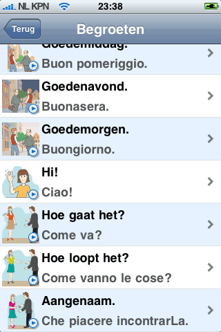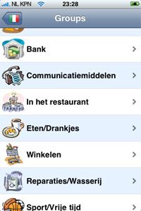 Dat is het eerste probleem dat ik met de Vertaalgids heb. Niemand heeft ooit 23 talen tegelijk nodig en daarom zou het handig zijn om elke taal als losse module aan te bieden. Dat zou de ruimte kunnen beperken en misschien de prijs ook, want eigenlijk is € 7,99 wel wat veel voor een iPhone app die, zoals zal blijken het niveau van het bovengenoemde taalgidsje niet haalt.