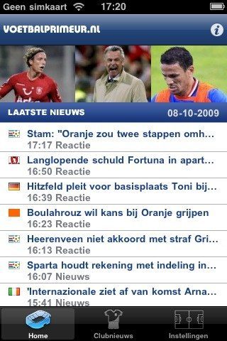 Voetbalprimeur Pro toont bij het opstarten van de applicatie een lijstje met het laatste nieuws. Bovenin zie je drie nieuwsfoto’s van recente artikelen, zodat je bij het zien van je favoriete voetballer meteen kunt doorklikken naar het bijbehorende artikel. De overige artikelen staan in een lijstje, voorzien van icoon of vlag: een Eredivisie-logo, Belgisch vlaggetje of oranje rechthoek bijvoorbeeld. Voetbalprimeur heeft gekozen voor een relatief klein lettertype, waardoor er behoorlijk wat nieuws op het scherm past. De nieuwsberichten zijn gesorteerd op datum en tijdstip, zodat je meteen ziet of het nieuws recent is.