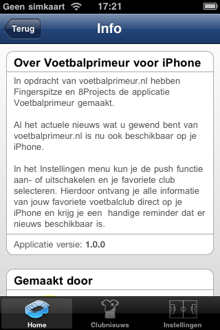 De review van Voetbalprimeur Pro is vorige week in het water gevallen omdat Voetbal International er overwacht tussendoor kwam fietsen. Vandaar nu een tweede kans voor deze voetbalapplicatie, die in twee varianten verkrijgbaar is: Voetbalprimeur Pro (€2,39) en Voetbalprimeur Gratis. Het grootste verschil tussen beide apps is dat er in de gratis versie een banner van drie tekstregels te zien is bovenin elk scherm. Een tweede verschil is dat je in de Pro-versie een aparte pagina met clubnieuws kunt instellen. Via de instellingen van de applicatie geef je aan van welke club je een apart nieuwsoverzicht wilt zien en over welke club je push notificaties wilt ontvangen (dit mag verschillend zijn).