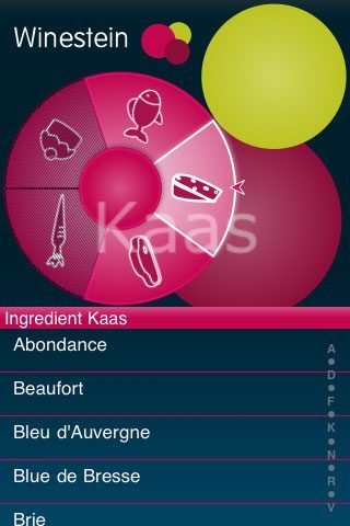 Bij het zoeken naar de best passende wijn kun je met een schuifknop de gewenste prijsklasse aangeven en daarbij valt op dat bij sommige gerechten een goedkopere wijn eigenlijk beter past, dan een dure. Als je Winestein opstart zie je een wiel met daarop de keuze vis, vlees of kaas. Wil je bijvoorbeeld een stuk brie eten, dan ben je in één keer klaar met de wijnaanbeveling Beaujolais Crus (score 9,5 van 10). Een witte Chardonnay of Côtes du Rhône doet het ook goed.