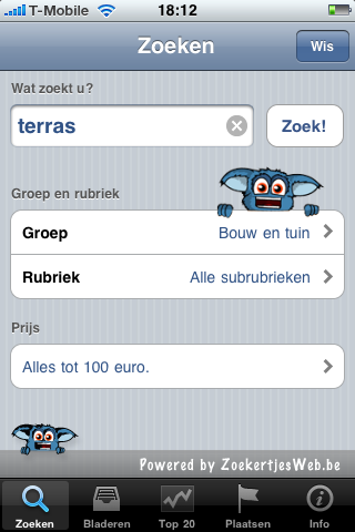 Wat voor ons Marktplaats.nl of 2dehands.nl is, is bij onze zuiderburen de website ZoekertjesWeb.be. Op ZoekertjesWeb kunnen gebruikers allerlei spullen te koop aanbieden of te koop vragen, variërend van computersoftware tot kunst en van banen tot babylotion. Voor deze website is nu een iPhone applicatie-ontwikkeld waarop alle advertenties van de website te doorzoeken en te bekijken zijn. Ook is het mogelijk om je eigen advertentie met foto(‘s) te plaatsen.