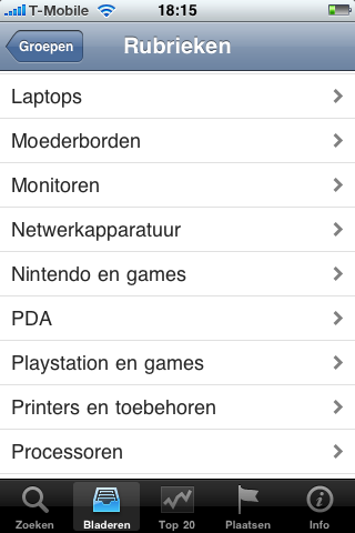 Wanneer je niet naar iets specifieks op zoek bent en gewoon door de verschillende rubrieken wilt bladeren kan dit ook. Je kiest eerst de hoofdrubriek, bijvoorbeeld Fotografie. Vervolgens krijg je de subrubrieken te zien zoals Lenzen, Flitsers, Geheugenkaarten, Statieven enz. Wanneer je een subrubriek kiest krijg je alle relevante advertenties van die rubriek te zien en kun je er op dezelfde manier doorheen gaan als na het uitvoeren van een zoekopdracht.
