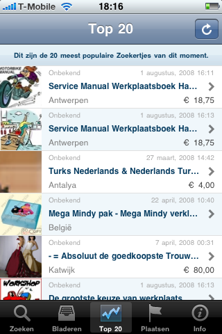 Zoekertjes heeft ook nog een overzicht van de 20 populairste advertenties. Dit gaat op basis van het aantal views van een advertentie. Deze functie voegt niet echt iets toe, meestal ben je toch gericht aan het zoeken naar wat je nodig hebt. Bovendien kom je in de Top 20 veel schreeuwerige advertenties en reclame tegen, niet echt nuttig dus.