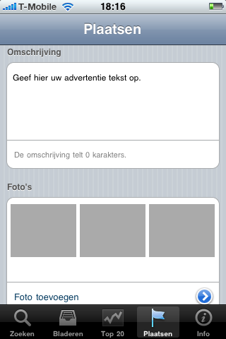 Het handige aan de Zoekertjes-applicatie is dat je ook zelf een advertentie kunt plaatsen. Dit gaat via het bijbehorende tabblad. Je kiest de hoofd- en subrubriek en geeft de advertentie vervolgens een titel. Daarna kies je of je iets aanbiedt of juist iets zoekt. Vervolgens geef je de prijs op en of het hier om nieuwe of tweedehands spullen gaat. In het hoofdveld type je de beschrijving van je advertentie. Daaronder kun je zien hoeveel karakters je beschrijving telt. Je kunt, als je wilt, daarna foto’s toevoegen aan je advertentie. Dit kan vanuit de filmrol van de iPhone of je kunt zelf op dat moment een foto maken.