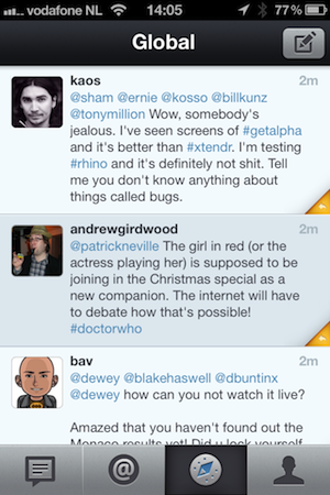 Rhino is een nieuwe app, gemaakt door Goran Vuksic. Na het installeren vul je je inloggegevens van App.net in, waarna je op het tabblad Global terechtkomt. Dit is de berichtenstroom wereldwijd, zonder rekening te houden met je vrienden. Net als bij veel Twitter-apps kun je een lijst met mentions bekijken of bladeren door de tijdlijn met berichten van zelf gekozen vrienden. Verandert er iets, bijvoorbeeld wanneer je nieuwe mensen bent gaan volgen, dan duurt het een paar seconden voordat je accountinformatie in Rhino is bijgewerkt.