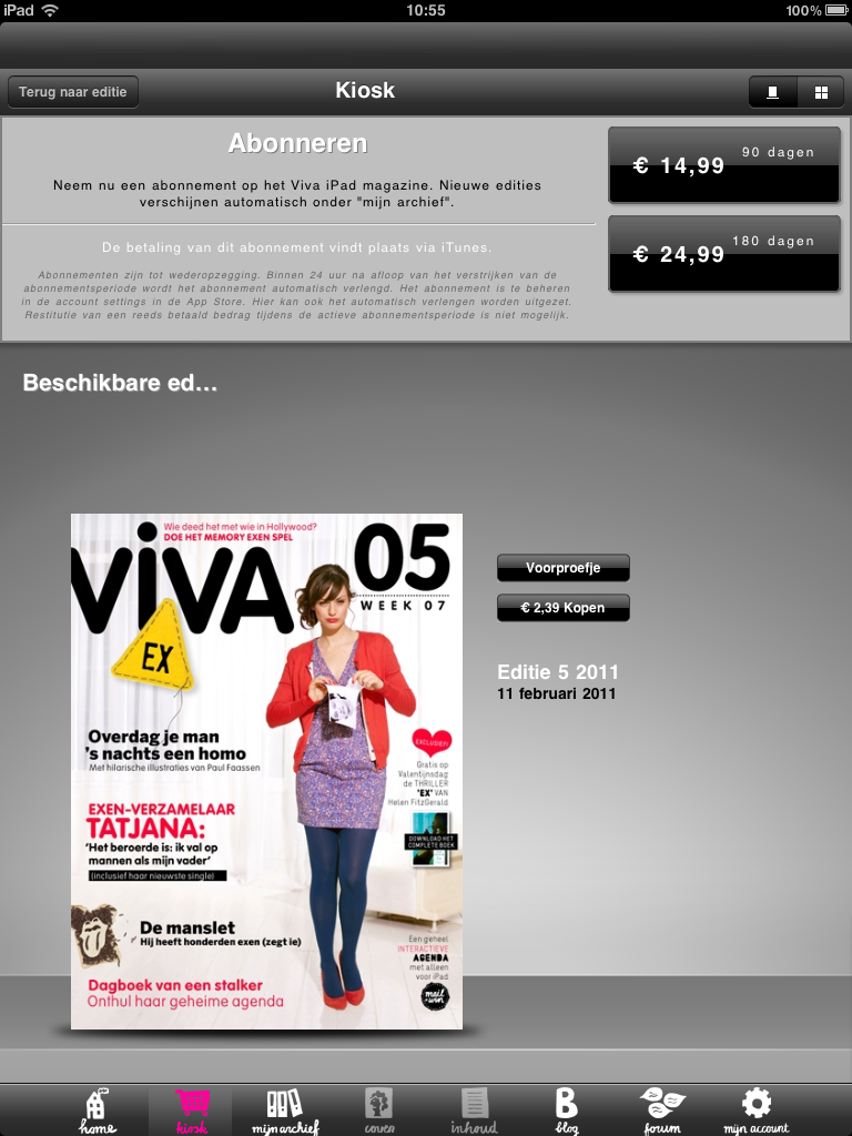 De Viva-applicatie heeft vandaag eveneens een update gekregen. Ook hier zijn de abonnementen toegevoegd. Via de Kiosk hebben gebruikers de keuze uit abonnementen voor de duur van een kwartaal (€14,99) of een halfjaar (€24,99). Ook hier zijn push notificaties toegevoegd en zijn er de nodige foutjes opgelost. Zowel voor Viva als AutoWeek geldt dat je, naast de abonnementen, ook nog steeds losse edities (€2,39 per editie) kunt aanschaffen.