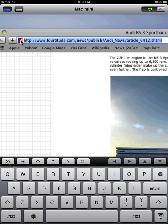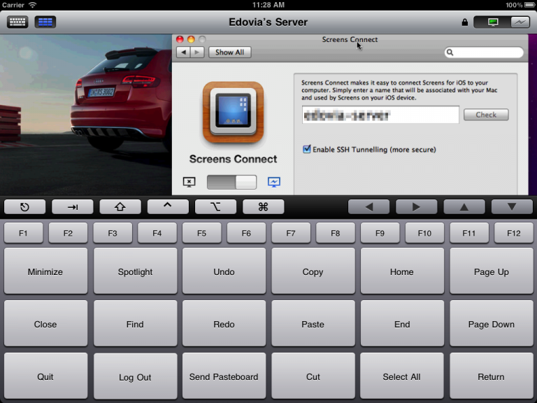 De applicatie bevat twee verschillende schermtoetsenborden. Eén daarvan is het standaard iOS-toetsenbord met een extra balk aan de bovenzijde die toegang biedt tot pijltjestoetsen of Mac-specifieke toetsen zoals Command en Control. Het tweede toetsenbord beschikt over dezelfde balk, maar heeft geen letters. In plaats daarvan krijg je zogenaamde ‘actie-knoppen’ te zien, waarmee je veelvoorkomende taken als knippen, kopiëren, minimaliseren en uitloggen kunt activeren. Het is ook mogelijk om op het scherm in te zoomen. Dit is met name handig op het kleinere scherm van de iPhone ten opzichte van de iPad. Voor Mac-gebruikers heeft de applicatie echter ook een speciale functie, waarmee je het Dock door middel van een swipe-beweging kunt weergeven als je deze standaard automatisch laat verdwijnen.