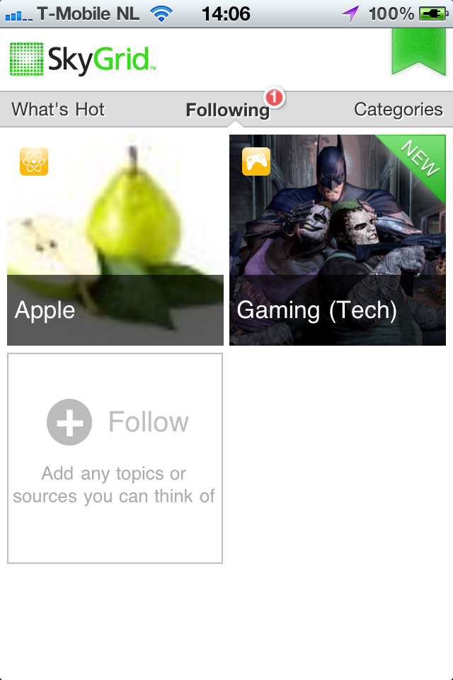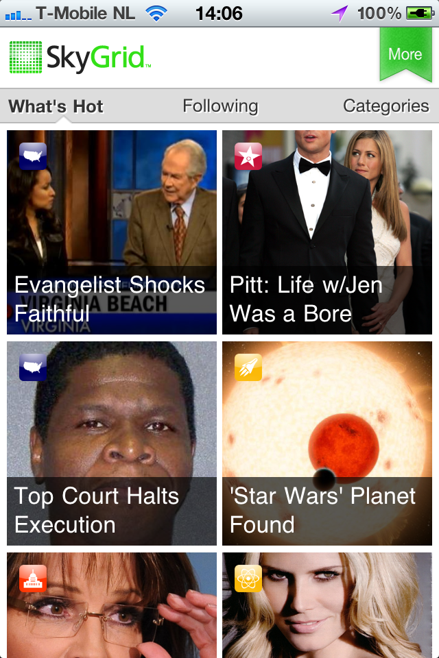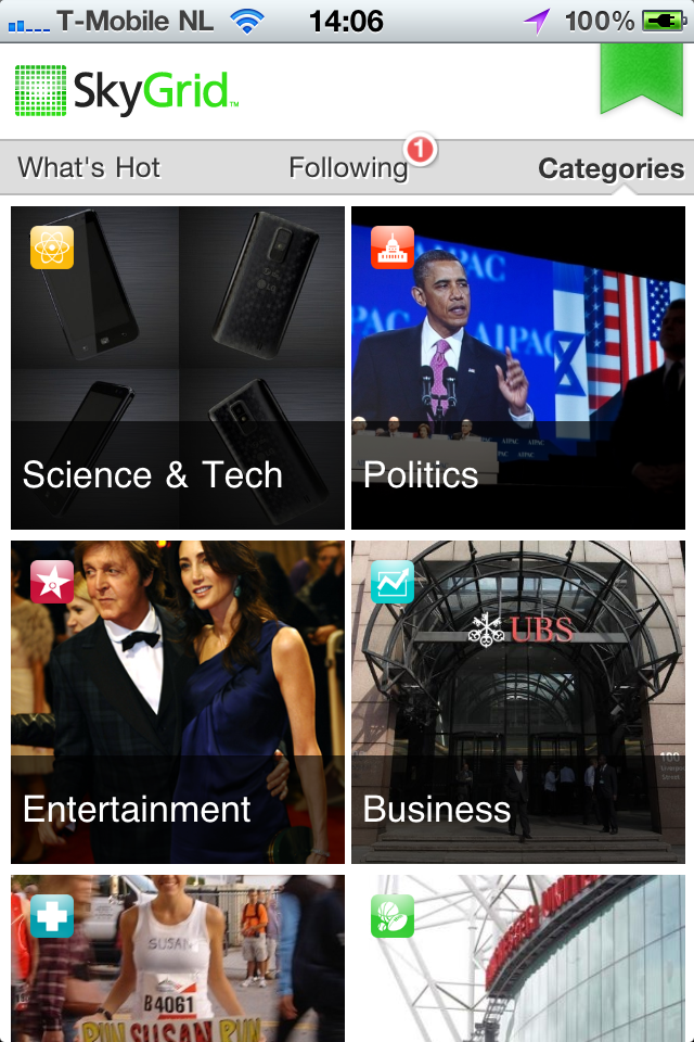 Wanneer je SkyGrid opstart kom je automatisch op een grid met het belangrijkste nieuws van de afgelopen 24 uur. Tap op een onderwerp en je komt op een nieuw grid aan artikelen, allemaal over dit ene onderwerp. Vind je een onderwerp interessant, dan kun je er een abonnement op nemen en de ontwikkelingen volgen via het Following-tabblad. Daar kun je tevens algemene nieuwsonderwerpen volgen om wat je leest te specialiseren.
