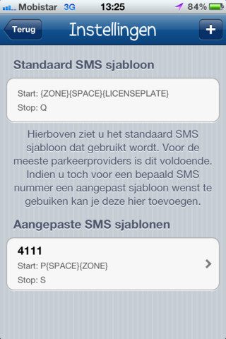 SMS-Parkeren iPhone iPod touchDe Belgische applicatie SMS-Parkeren is een hulpje voor wie wel eens parkeert in een garage of op een plek waar je met SMS-berichten kan betalen. De app ontneemt je de moeite om zelf sms’jes samen te stellen en presenteert standaard sms-sjablonen voor de Belgische diensten P-Mobile en 4111. In Nederland wordt de beheerder SMS Parking ondersteund. Wie gebruik maakt van andere SMS-diensten, kan handmatig een sjabloon toevoegen.