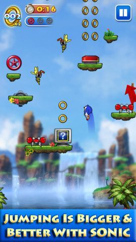 Naar loopings en buizen zal je echter tevergeefs op zoek gaan: Sonic Jump houdt de Doodle Jump-formule vrij nauw aan. De mascotte springt vanzelf en je kantelt de iPhone om de richting van de sprong te bepalen. Met een tik in beeld kan je echter wel een extra sprong inzetten om hoger te komen, een truc die je vanaf level 2 al nodig hebt. Daarin worden hoog gelegen platformen gecombineerd met bruine platformen die meteen afbrokkelen nadat je erop springt. Als je de zijkant van het beeld op springt, kom je er aan de andere kant weer uit. Aan het einde van elk level wacht een tegenstander die al je ringen zomaar kan afpakken en die je het liefst vermijd om een aardige score met de verzamelde ringen neer te zetten. Ondertussen kan je ook power-ups pakken door computerschermen kapot te springen en zijn er drie rode sterren te pakken voor een hogere score. Ook de snelheid draagt bij aan een hoge score, en zo kan het flink lastig worden de A-score uit een level te halen. Gelukkig hoef je een level alleen maar te eindigen voordat je de volgende vrijspeelt.