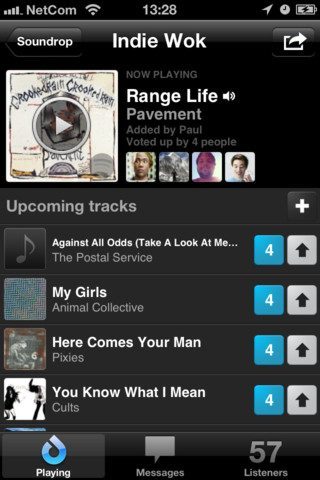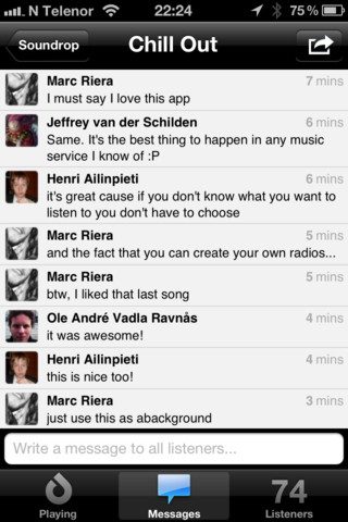 Eenmaal in een afspeellijst, kan je meer dan muziek luisteren en stemmen. Zo kan de lijst gedeeld worden via Facebook, Twitter, e-mail en sms. Met een knop rechts onderin zie je hoeveel luisteraars er actief zijn in de afspeellijst en wie het zijn. Leuker is nog de knop Messages waarmee je berichten kan uitwisselen met de andere luisteraars. Net als bij de update-counter van een app, laat een rood cijfer in de hoek zien hoeveel nieuwe berichten er zijn geschreven. Zo is Soundrop FM ook een chatbox voor muziek – en kan je er misschien wel een feestje mee bouwen zonder dat je er op een aanwezig bent.