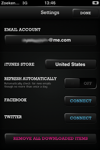 Na zo’n 3 minuten wachten zijn mijn 300 e-mails opgehaald en kan ik een lijst bekijken van alle applicaties die ik in de loop van de tijd heb gekocht. Gratis applicaties die je hebt verkregen via een promocode of die je tijdens acties zoals FreeAppADay hebt verzameld, tellen dus niet mee in je totale uitgaven. Handig is, dat je ook kan sorteren op dure applicaties (van duur naar goedkoop), sorteren op aankoopdatum of op naam. Het is dus zaak om alle e-mails die je van Apple krijgt te bewaren. Ik heb dat niet gedaan, waardoor een deel van mijn aankoopgeschiedenis mist. Je kunt vanuit de applicatie ook nog je accountgegevens van Facebook en Twitter invoeren, maar ik had niet zo’n behoefte om mijn vrienden te vermoeien met reclameteksten voor een app die ik zelf heb gekocht. De ontwikkelaar geeft ook niet aan waartoe die inloggegevens dienen: gaat de app een tweet sturen zodra ik iets koop? Doe maar niet!