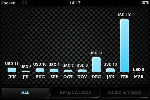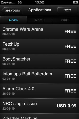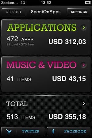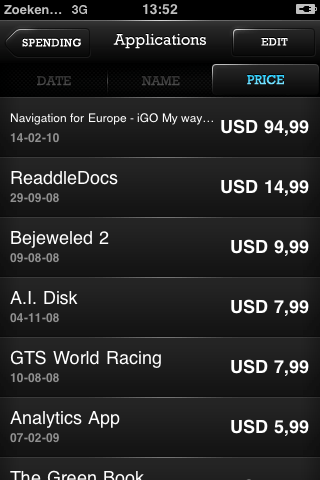 Ik had er wel $1,99 voor over om te kijken hoe zinvol deze applicatie is, als je meerdere accounts hebt. Aan een applicatie die alleen naar Amerikaanse accounts kijkt heb je niet zoveel. Het feit dat de applicatie niet in de Nederlandse App Store verkrijgbaar is, voorspelt wat dat betreft al weinig goeds. SpentOnApps kijkt trouwens niet alleen naar de aankopen van iPhone-applicaties, maar ook naar muziek en muziekvideo’s die je hebt gekocht.