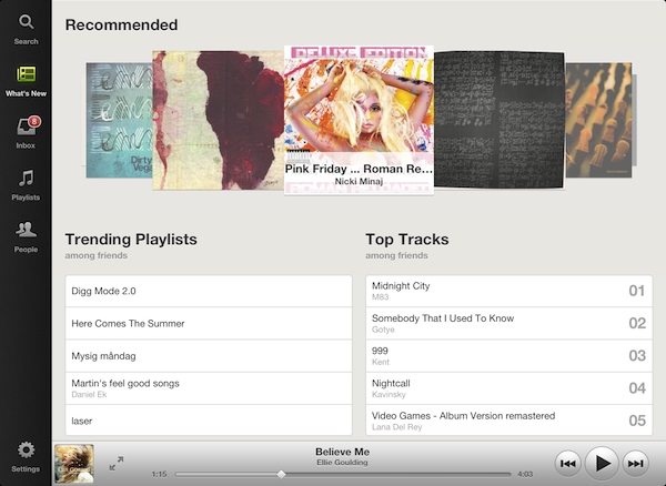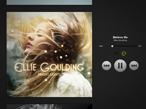 De interface van de app is opgedeeld in zogenaamde tegels die je over elkaar heen kunt schuiven. Dit doet sterk denken aan de interface van de officiële Twitter-applicatie voor de iPad. Je kunt eenvoudig zoeken in de Spotify-catalogus, zien wat recent is toegevoegd en je eigen afspeellijsten beheren. Ook heb je toegang tot je inbox die voortaan per gebruikers is ingedeeld en kun je zien welke muziek populair is onder je vrienden. Albumhoezen worden in een hoge resolutie weergegeven en je kunt deze bovendien schermvullend weergeven alsof het je eigen persoonlijke jukebox is. Je kunt vervolgens met een eenvoudige veegbeweging naar naar het vorige of volgende nummer gaan.